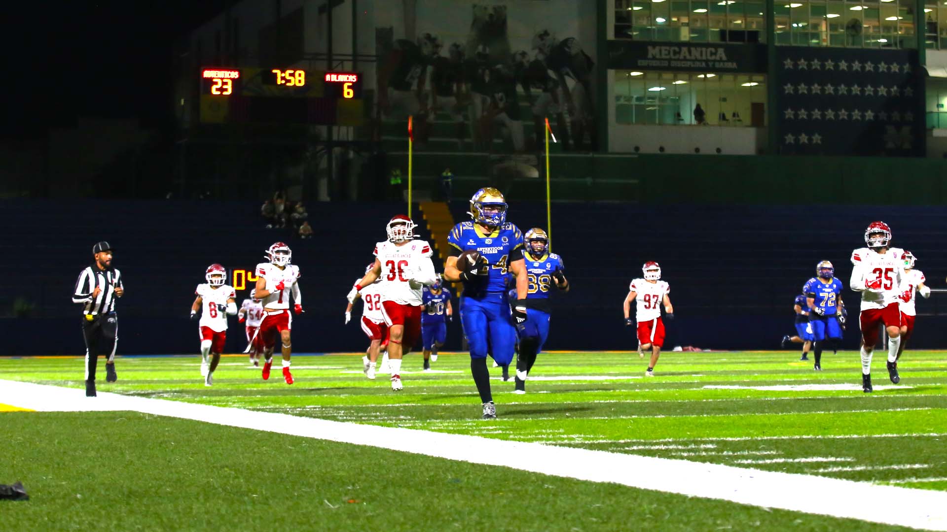 La patada de despeje la tomó Javier Berlanga (83), quien atravesó el campo y corrió más de 70 yardas para anotar y poner el marcador 7-0 a favor de la UANL con el punto extra de Kevin Morales (30).