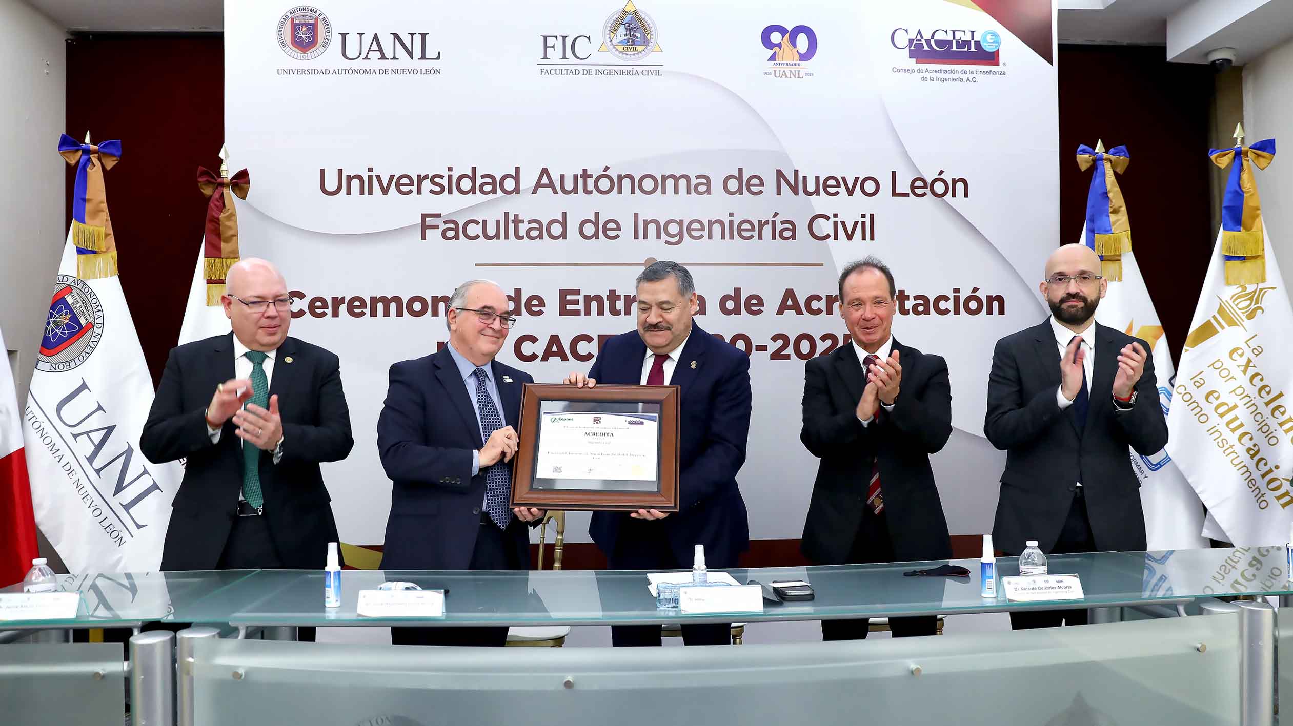 La calidad educativa del programa académico Ingeniero Civil de la Universidad Autónoma de Nuevo León fue certificado por cinco años por el Consejo de Acreditación de la Enseñanza de la Ingeniería (CACEI).