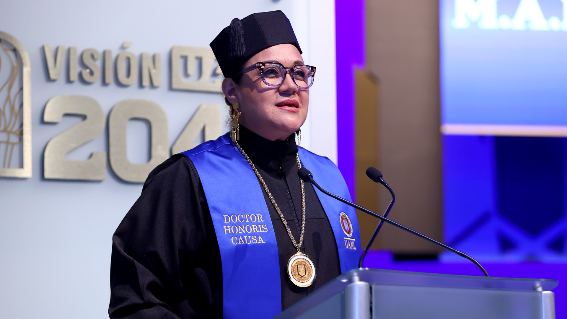 “Agradezco a la Universidad Autónoma de Nuevo León por esta distinción y muy honrada, pues es considerada la más sustentable del país de acuerdo a rankings internacionales. Prometo llevar con mucho honor y mucha responsabilidad este grado de Doctor Honoris Causa que se me está otorgando”, señaló.