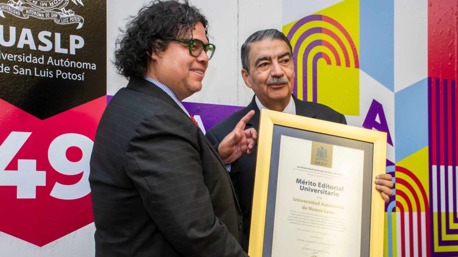 La Editorial Universitaria de la Universidad Autónoma de Nuevo León fue reconocida el 28 de marzo con el Mérito Editorial Universitario que otorga la Universidad Autónoma de San Luis Potosí, en el marco de la Feria Nacional del Libro UASLP 2025.