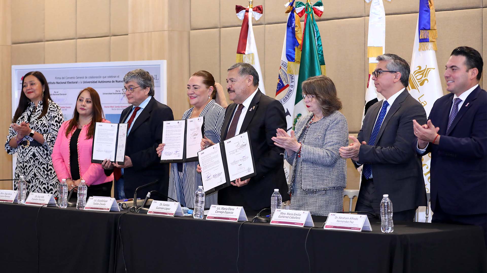 La Universidad Autónoma de Nuevo León y el Instituto Nacional Electoral (INE) firmaron el 17 de octubre un convenio general y específico de colaboración para la realización del monitoreo de espacios que difunden noticias durante las precampañas y campañas del Proceso Electoral Federal 2023-2024.