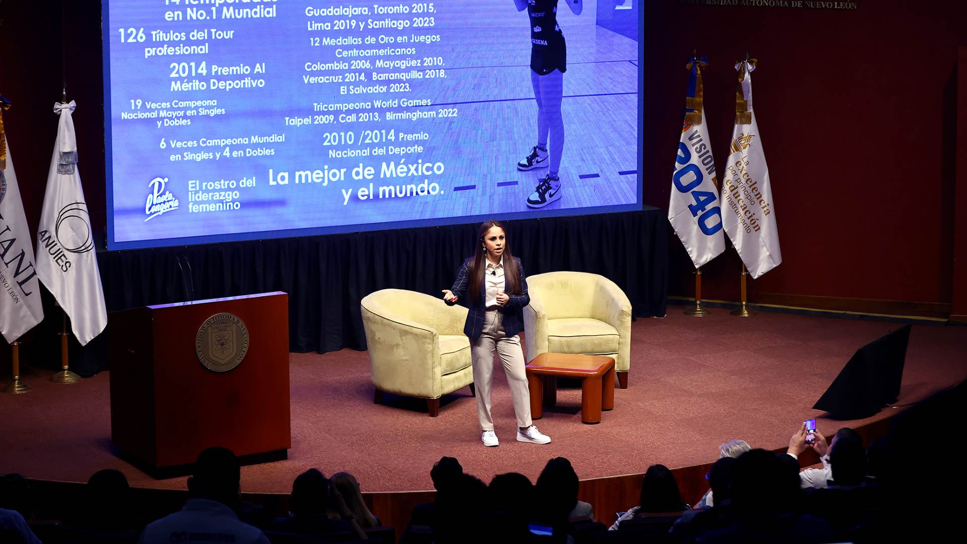 En el marco del Congreso ANUIES del Deporte Universitario, el cual tiene como sede la Universidad Autónoma de Nuevo León (UANL), la atleta Paola Longoria dictó la conferencia titulada “El éxito: el resultado de un todo”.