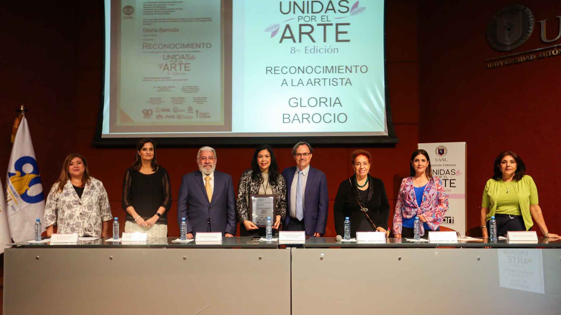 Después de mostrarse una semblanza audiovisual de Gloria Barocio en el auditorio de la hemeroteca, la artista recibió un reconocimiento especial a la Trayectoria en las Artes Plásticas.